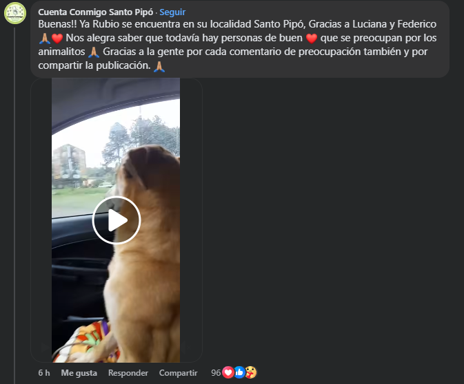 La publicación despertó la preocupación de los “mascoteros” de la zona. Finalmente, dos vecinos, Luciana y Federico, trasladaron al perro en su vehículo hasta Santo Pipó, donde fue recibido por conocidos y compartido luego en la cuenta Cuenta Conmigo Santo Pipó: “Ya Rubio se encuentra en su localidad. Gracias a Luciana y Federico. Nos alegra saber que todavía hay personas de buen corazón que se preocupan por los animalitos”.