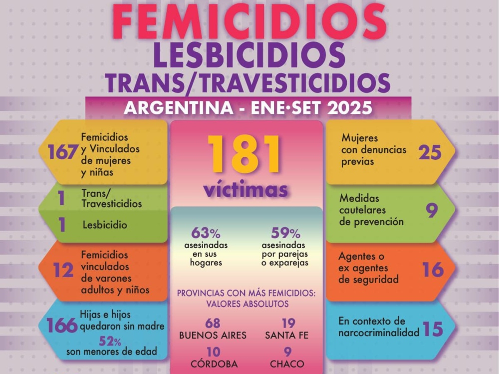 Entre el 1 de enero y el 30 de septiembre de 2025, Argentina registró un total de 167 femicidios y relacionados, además de un lesbicidio y un transfemicidio, según el último informe del Observatorio de Femicidios “Adriana Marisel Zambrano” de La Casa del Encuentro. A estos hechos se suman 12 femicidios vinculados de varones adultos y niños, completando 181 víctimas de violencia de género en los primeros nueve meses del año.