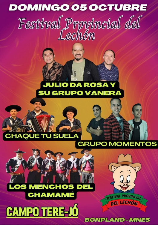 Este domingo 5 del corriente se llevará a cabo la undécima edición de la Fiesta Provincial del Lechón, en la localidad de Bonpland, donde todo el pueblo espera ansioso la llegada de los visitantes para una de las celebraciones más populares de la zona, en el Campo Tere-jó (a la vera de las rutas Provincial 4 y 207).