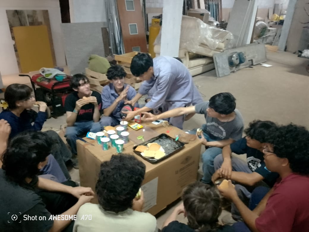 Los estudiantes estaban construyendo en el patio de la casa de uno de sus compañeros del barrio A3-2 y, ante el temporal, necesitaban con urgencia un lugar techado para resguardar la estructura y seguir adelante con el proyecto. Fue entonces cuando la profesora asesora de la 34, Norma Iriarte, se comunicó con su par de la EPET Nº1 “La Industrial”, Andrea Prece, quien no dudó en tender una mano.