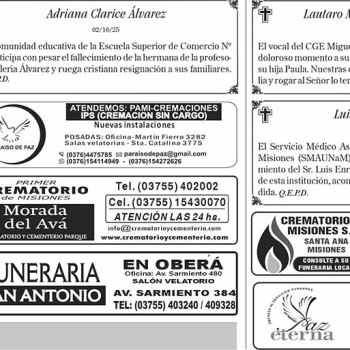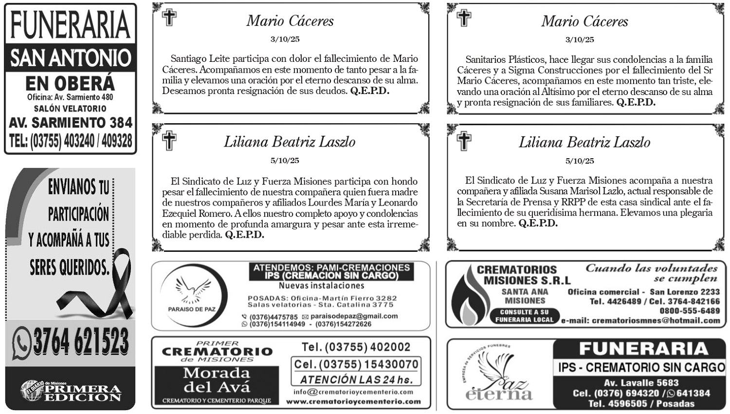• Fúnebres del Viernes 3 de Octubre de 2025