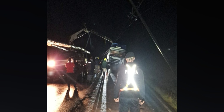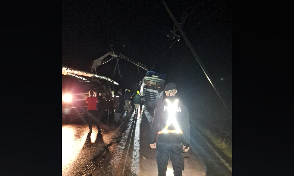 Un camión Scania impactó contra un poste de alta tensión de la Línea de 33kV caído sobre la ruta, provocando daños materiales y el corte del suministro eléctrico en una amplia zona de 25 de Mayo y alrededores.