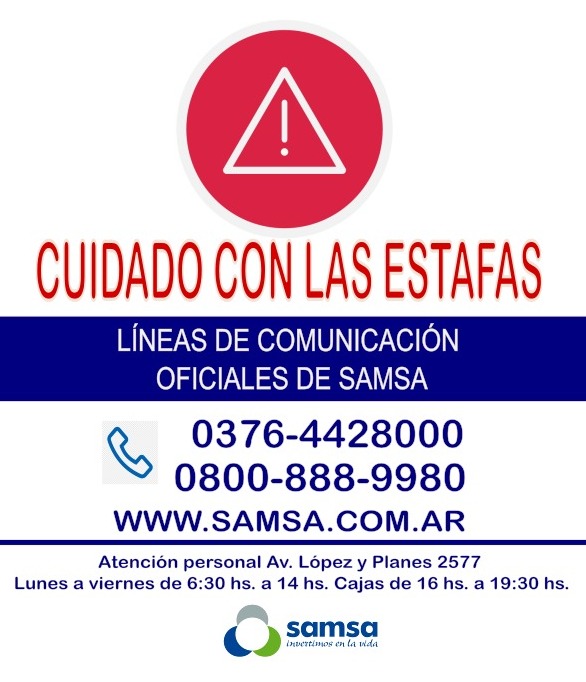 También se pueden realizar consultas y trámites a través del sitio web oficial www.samsa.com.ar.Samsa reiteró la importancia de no brindar datos personales ni realizar pagos fuera de los canales oficiales, ante el incremento de intentos de fraude digital vinculados a servicios públicos.