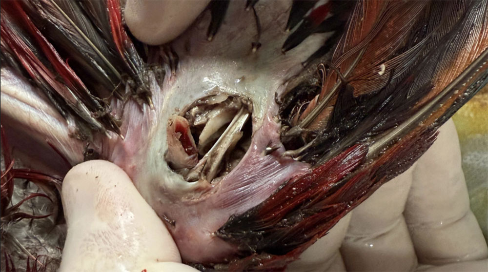 El análisis forense y la investigación de campo sugieren que el guacamayo fue herido mientras volaba. La fundación no encontró otras heridas que sugirieran un ataque animal.