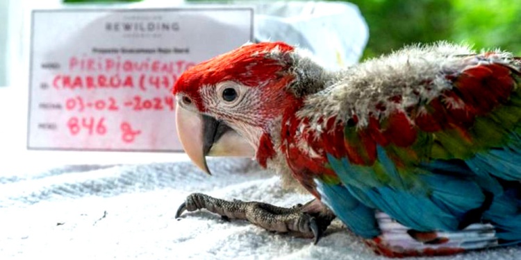 “Una familia nos informó que había encontrado un guacamayo herido. Rápidamente, acudimos a la dirección proporcionada, donde encontramos a Charrúa con una lesión con sangre en el ala derecha”, explicó Marianela Masat, coordinadora del proyecto de reintroducción de guacamayos rojos en Rewilding Argentina.