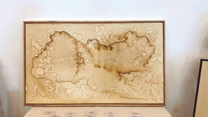 Dentro de esa exploración, también hay lugar para lo experimental. Una de sus obras más singulares está realizada con manchas de café. Allí, el líquido funciona como pigmento, casi como si fuera una tinta improvisada, que al secarse deja huellas irregulares, matices cálidos y hasta un rastro aromático. El café, cotidiano y familiar, se convierte en medio artístico y le da a la obra una dimensión sensorial inesperada. No solo se observa: también se huele, también se imagina.
