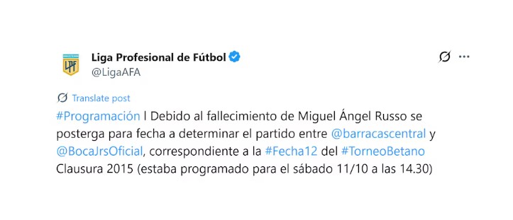 “Debido al fallecimiento de Miguel Ángel Russo se posterga para fecha a determinar el partido entre Barracas Central y Boca Juniors, correspondiente a la fecha 12 del Torneo Clausura 2025 (estaba programado para el sábado 11/10 a las 14.30)”, rubricó la entidad madre del fútbol nacional en su cuenta de X. Próximamente, dará a conocer su reprogramación.