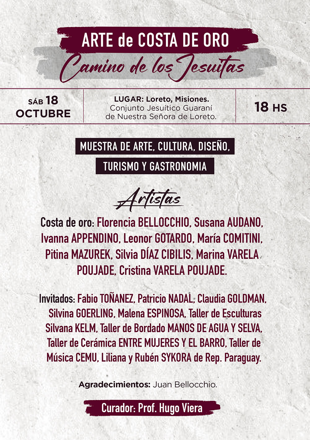 Además de la exposición, la muestra busca convertirse en un punto de encuentro entre el arte y el turismo cultural, revalorizando a los conjuntos jesuíticos como Patrimonio de la Humanidad. El curador, profesor Hugo Viera, explicó que el evento no es solo una exhibición, sino “un recorrido que invita a descubrir y redescubrir nuestra identidad”.