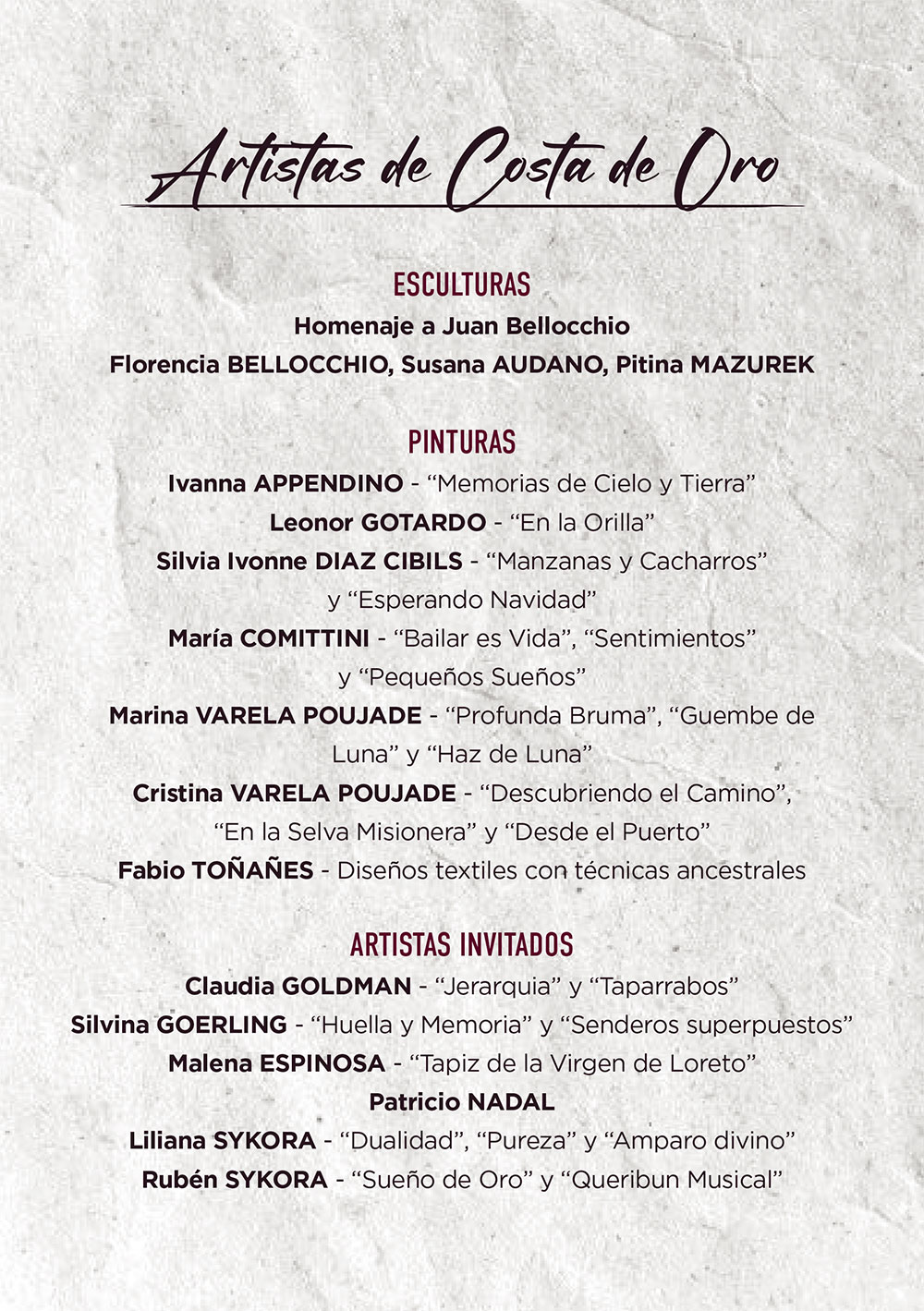El programa incluirá una amplia gama de obras de artistas de Costa de Oro, con la presencia de expositores como Florencia Bellocchio, Susana Audano, Ivanna Appendino, Leonor Gotardo, Silvia Díaz Cibils, María Comitini, Pitina Mazurek, Fabio Toñañes y Silvina Goerling, entre otros. Las organizadoras también presentarán sus propias creaciones: Marina Varela Poujade exhibirá obras como “Profunda Bruma” y “Guembé de Luna”, mientras que Cristina Varela Poujade mostrará “Descubriendo el Camino” y “En la selva misionera”.