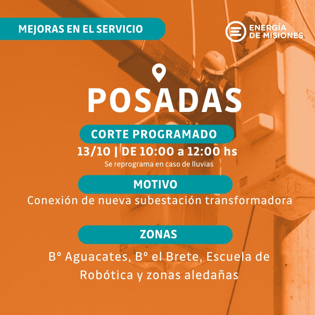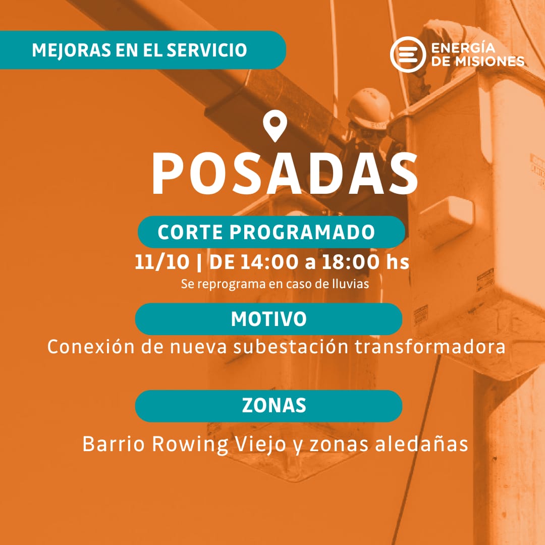 En Posadas, este sábado 11 habrá dos cortes. El primero será de 14:00 a 18:00, por la conexión de una nueva subestación transformadora que afectará al barrio Rowing Viejo y zonas aledañas. El segundo está previsto de 14:00 a 16:00, por el montaje de una nueva línea de 13,2 kV, que impactará en los barrios Sol de Misiones 1 y 2, Bicentenario, Club de Camioneros y la zona de las avenidas 200 y 147.