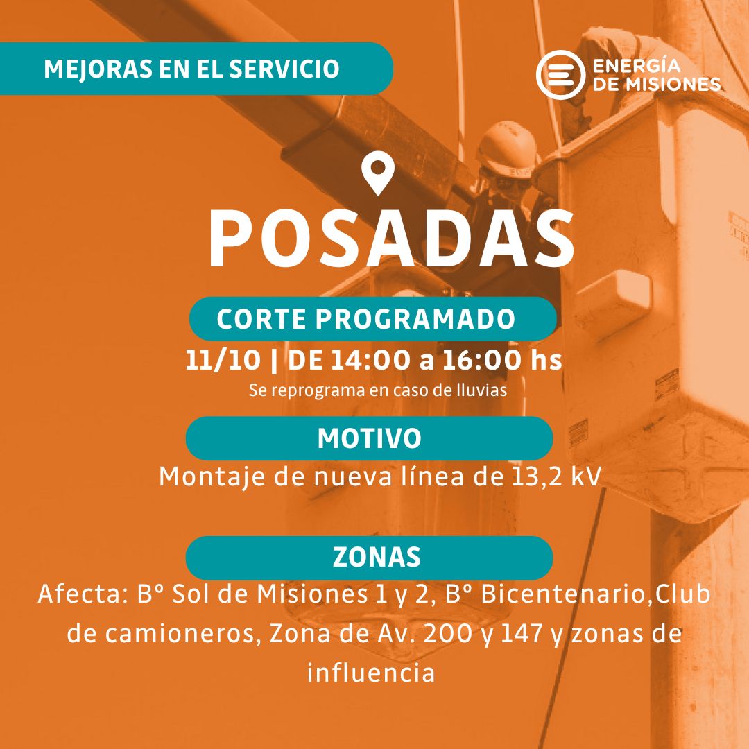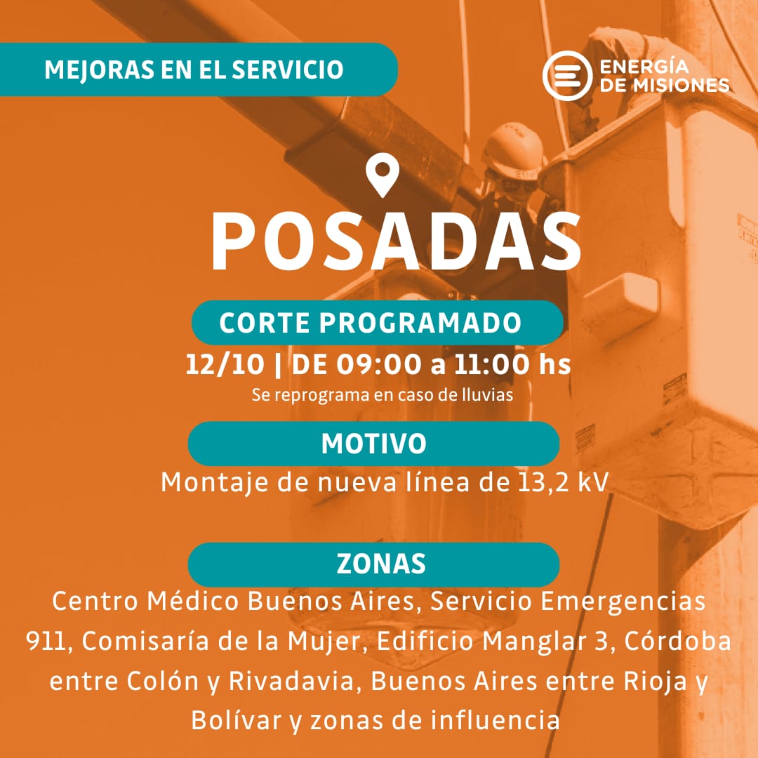 El domingo 12, habrá nuevos cortes en Posadas de 09:00 a 11:00 para continuar con el montaje de una nueva línea de 13,2 kV, afectando al Centro Médico Buenos Aires, Servicio de Emergencias 911, Comisaría de la Mujer, Edificio Manglar 3 y sectores de las calles Córdoba, Buenos Aires, Colón, Rivadavia, Rioja y Bolívar.