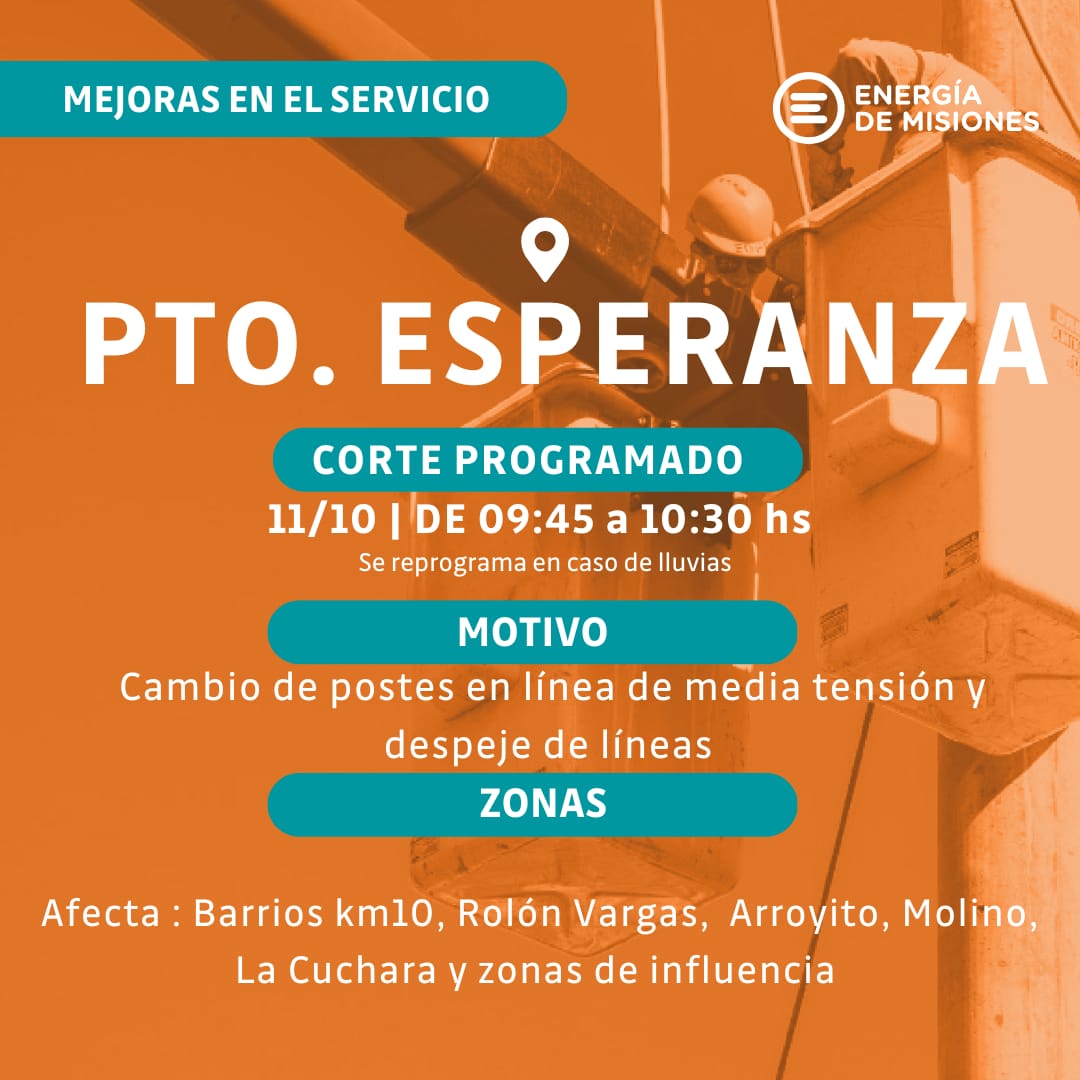 En Puerto Esperanza, el corte se desarrollará el sábado 11, entre 09:45 y 10:30, por tareas de cambio de postes en líneas de media tensión y despeje de vegetación. Alcanzará a los barrios km 10, Rolón Vargas, Arroyito, Molino, La Cuchara y zonas cercanas.