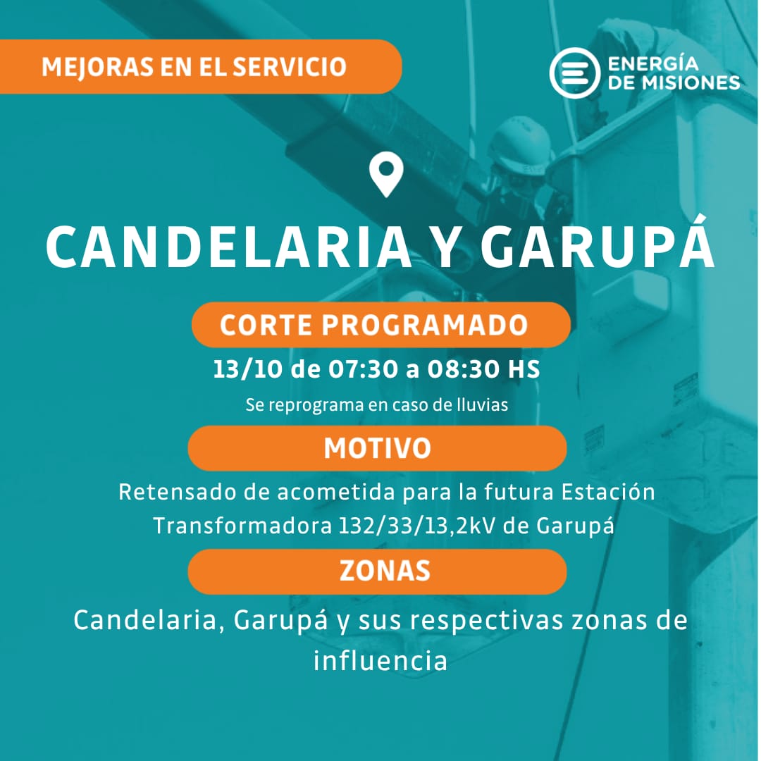 Finalmente, el lunes 13, en Candelaria y Garupá habrá un corte entre 07:30 y 08:30, por tareas de retensado de acometida para la futura Estación Transformadora 132/33/13,2 kV de Garupá. En Posadas, ese mismo día se interrumpirá el servicio de 10:00 a 12:00, para realizar la conexión de una nueva subestación transformadora que afectará a los barrios Aguacates, El Brete, Escuela de Robótica y zonas cercanas.