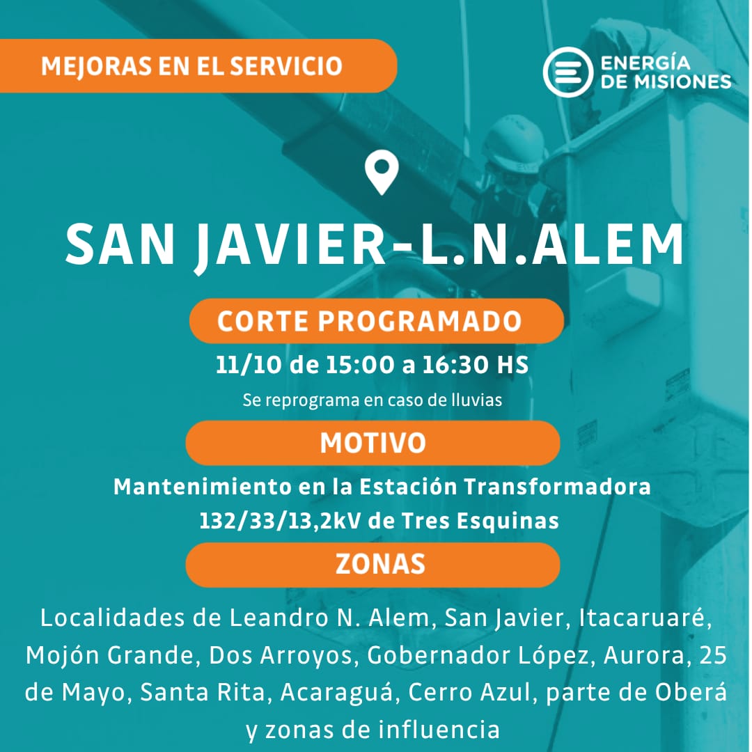 Por otra parte, San Javier y Leandro N. Alem registrarán una interrupción el sábado 11 de 15:00 a 16:30, debido a tareas de mantenimiento en la Estación Transformadora 132/33/13,2 kV de Tres Esquinas. Se verán afectadas las localidades de Leandro N. Alem, San Javier, Itacaruaré, Mojón Grande, Dos Arroyos, Gobernador López, Aurora, 25 de Mayo, Santa Rita, Acaraguá, Cerro Azul y parte de Oberá.