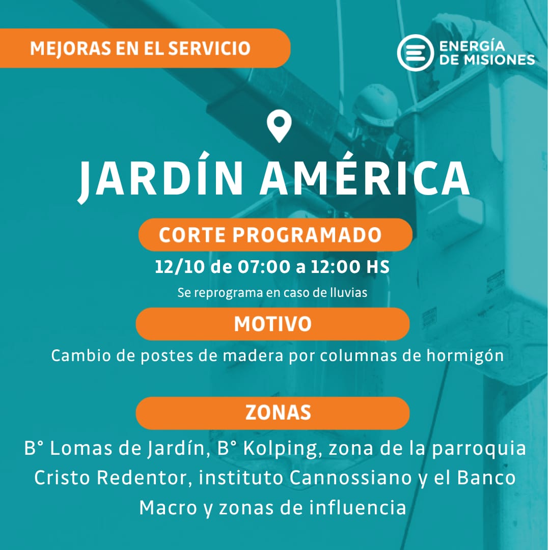 También ese día, Jardín América tendrá una suspensión del suministro de 07:00 a 12:00, por el cambio de postes de madera por columnas de hormigón, que impactará en los barrios Lomas de Jardín, Kolping, zona de la parroquia Cristo Redentor, Instituto Cannossiano, Banco Macro y alrededores.