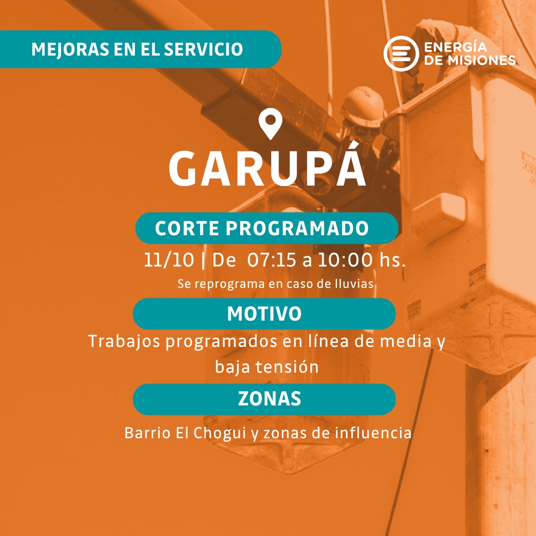 En Garupá, el suministro se interrumpirá también el sábado de 07:15 a 10:00, para realizar trabajos programados en líneas de media y baja tensión, afectando al barrio El Chogui y áreas de influencia.