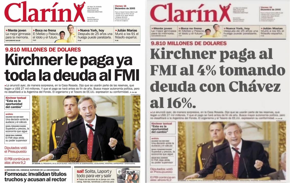 La tapa original de Clarín de diciembre de 2005, que se viralizó rápidamente para desmentir al Presidente, titulaba en realidad: “Kirchner le paga ya toda la deuda al FMI“. En la bajada de la noticia real, se explicaba que el pago se realizaría utilizando parte de las reservas del Banco Central, sin hacer ninguna mención a la toma de deuda con Venezuela o a las tasas de interés mencionadas por Milei.