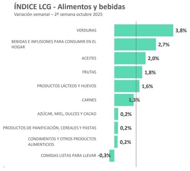 Pese a la reciente estabilidad monetaria que consiguió la gestión nacional tras el anuncio del salvataje estadounidense, la consultora LCG, destacó en su informe más reciente que los incrementos en la segunda semana de octubre en alimentos y bebidas fueron del 1,4% en promedio. En su último análisis precisó que “el porcentaje de productos sin variación de precios se mantuvo en 80%, por lo que los aumentos están concentrados en menos productos pero son más pronunciados”.