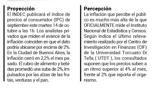 La medición oficial de la inflación registró 1,9% en agosto mientras que el martes se conocerá el dato de septiembre, que instalaría el nivel en el piso de los dos puntos porcentuales. Con todo, la preocupación volvió a ceñirse en los precios de los alimentos, que continúan siendo el principal desafío del Gobierno, ya que tienen una fuerte incidencia en el Índice de Precios al Consumidor (IPC).