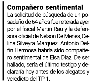 Se aguarda para hoy, desde las 9, la declaración del último testigo (ayer ausente nuevamente) y presunto novio de Elsa Díaz. Luego será tiempo y lugar para alegatos del fiscal Martín Rau y la defensora oficial Celina Silveyra Márquez, análisis respectivo y veredicto de los jueces.