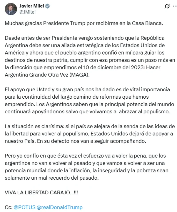 “Muchas gracias Presidente Trump por recibirme en la Casa Blanca”, comenzó Milei su posteo en la red social X. Allí, reafirmó su promesa de campaña de convertir a Argentina en un “aliado estratégico” de Estados Unidos, un paso que consideró fundamental para “Hacer Argentina Grande Otra Vez (MAGA)”, en un claro guiño al eslogan de su par norteamericano.