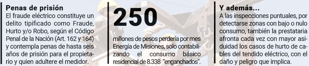 En lo que va del año, Energía de Misiones realizó poco más de once mil inspecciones con el propósito de prevenir y castigar tanto el fraude eléctrico como el hurto de energía, en zonas residenciales, edificios y comercios que recurren a maniobras varias para evitar el pago de la energía consumida, perjudicando al resto de los usuarios y ocasionando pérdidas millonarias. Los resultados terminaron siendo alarmantes, principalmente por la cantidad de conexiones directas a la red eléctrica, sin medidor, que totalizan 8.338 y el impacto económico negativo.