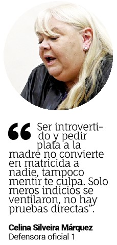 El alegato de la defensora oficial 1, Celina Silveira Márquez, también resumió su hipótesis de lo sucedido en la casa de la calle Uruguay casi Corrientes en Candelaria. Insistió en que “ninguno de los testimonios del expediente y los escuchados en el debate brindan certezas del suceso”. Respecto a la conducta de De Menes, lo contuvo: “Ser introvertido y pedir plata a la madre no convierte en matricida a nadie, tampoco mentir te culpa. Solo meros indicios se ventilaron y no hay pruebas directas”.