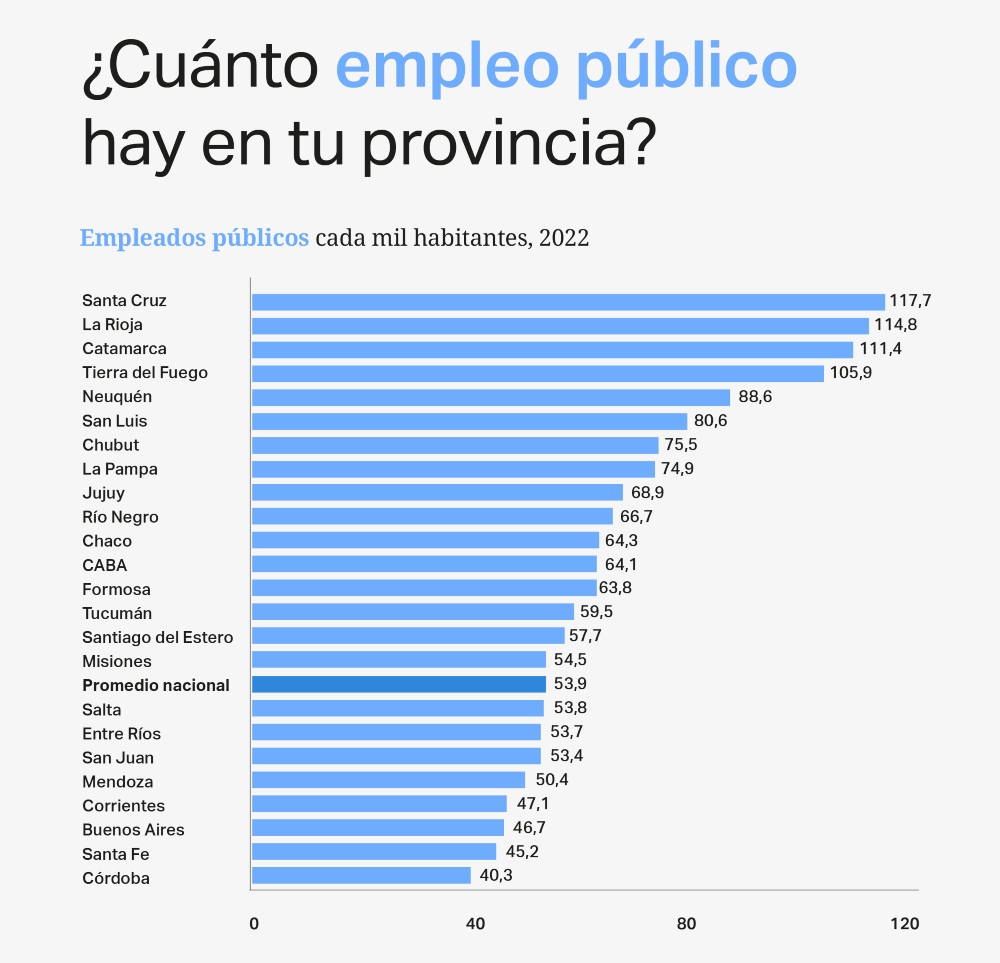 En el ranking nacional, Santa Cruz lidera con 117,7 empleados públicos cada mil habitantes, seguida por La Rioja (114,8), Catamarca (111,4) y Tierra del Fuego (105,9). En el otro extremo aparecen Córdoba (40,3), Santa Fe (45,2) y Buenos Aires (46,7), que registran los índices más bajos del país.