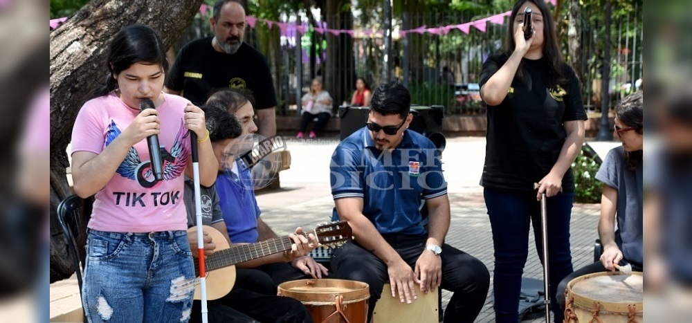 Esteban Galarza acompañó las actividades que se realizaron en la plaza 9 de Julio el miércoles. Es usuario de bastón blanco por un cuadro de ceguera adquirida y asiste al Centro Santa Rosa hace más de 15 años.