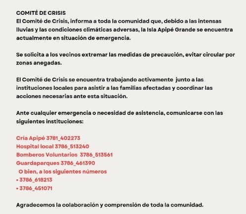El Comité de Crisis, integrado por los Bomberos Voluntarios de Apipé, la Policía de Corrientes, Salud Pública de la Provincia y la Municipalidad de San Antonio, trabajan de manera ardua para asistir a la población damnificada.