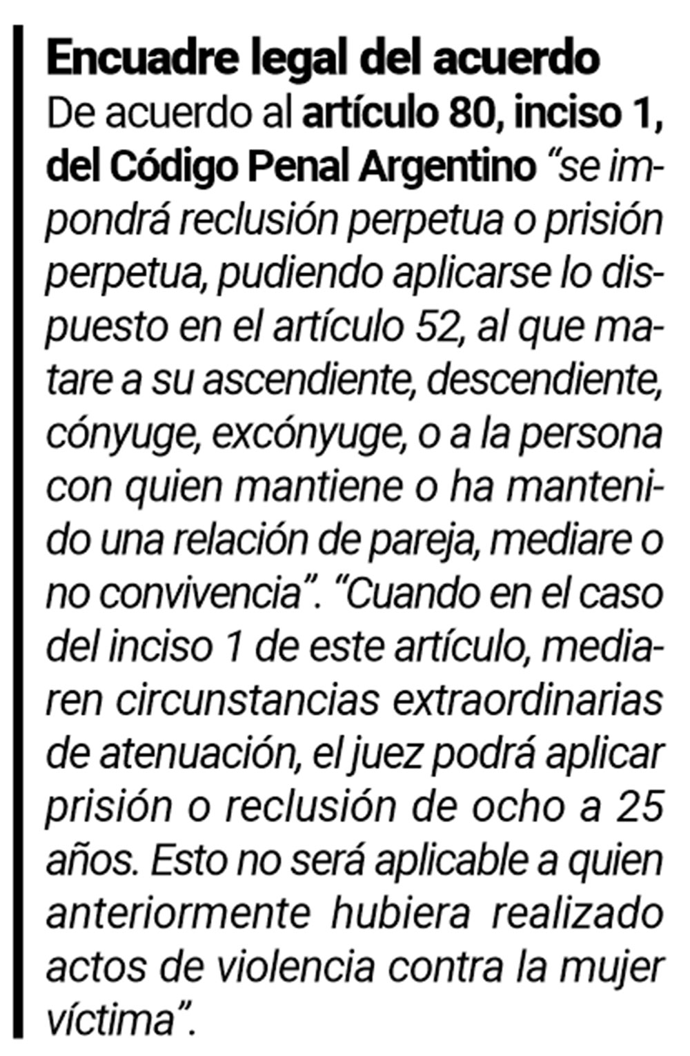 La mujer de 34 años está acusada de “homicidio agravado por el vínculo”, artículo 80 inciso 1 del Código Penal Argentino, que establece como pena de culpa la prisión o reclusión perpetua, únicamente.