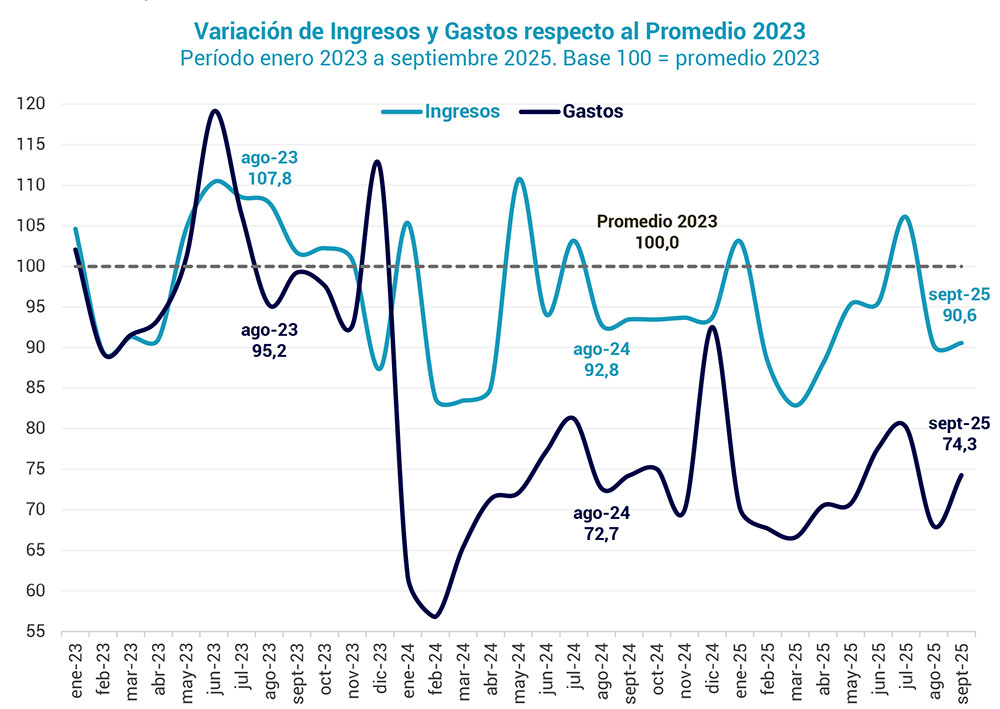 En el acumulado de los primeros nueve meses del año, el déficit financiero real ascendería a $17,21 billones, una cifra que contrasta con el superávit que se muestra oficialmente. En ese mismo período, los ingresos cayeron 7,6% en términos reales frente a 2023, mientras que los gastos públicos se redujeron 28%, consolidando el ajuste iniciado el año anterior.