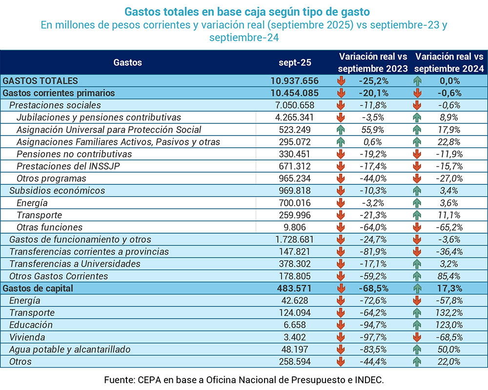 El gasto total fue de $10,94 billones, sin variación interanual, aunque 25,2% menor que en 2023. Según el CEPA, esto confirma la profundización del ajuste fiscal, con fuertes reducciones en prestaciones sociales, subsidios, transferencias y salarios públicos.