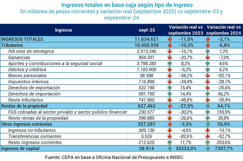 El estudio detalla que los ingresos totales alcanzaron $11,63 billones, con una baja interanual del 3,1%. La caída se explica principalmente por la descontinuación del Impuesto PAIS a fines de 2024, que hubiera aportado unos $7,34 billones adicionales en lo que va de 2025. También se registraron fuertes caídas en Bienes Personales (-92,1%), Ganancias (-7%) y Derechos de Exportación (-25,6%), afectados por la reducción de retenciones al 0% dispuesta por el Decreto 682/2025.