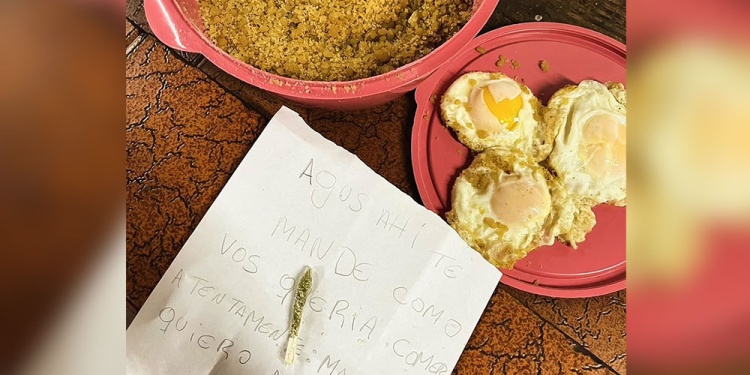 Durante el control rutinario de seguridad, el llavero de servicio advirtió irregularidades en el interior de la vianda. Al inspeccionar cuidadosamente el plato de reviro, halló ocultos entre la preparación un cigarrillo armado con sustancia vegetal y pequeñas hojas molidas de color marrón.