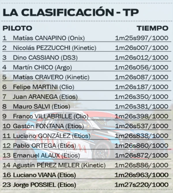Viana finalizó 16°, a 966 milésimas del poleman, Matías Canapino (Chevrolet Onix), mientras que Possiel culminó 23°, a 1s223/1000 del actual escolta de Felipe Martini (Renault Clio), quien lidera el campeonato y ayer clasificó en la sexta posición.