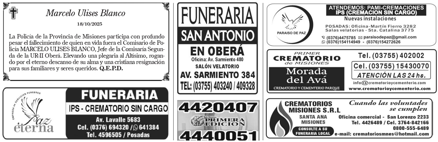 • Fúnebres del Sábado 18 de Octubre de 2025