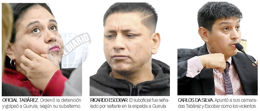 Respecto a los efectivos del Comando, Da Silva señaló que el acusado Ricardo Rafael Escobar le pide el gas pimienta a Lucas Nahuel Saravia Allosa y que este último le rocía el químico en el rostro a Guirula que oponía resistencia al arresto. “Escobar y Tabárez le patean la cabeza y no había necesidad alguna, ya estaba esposado”, relató Da Silva los movimientos para intentar subirlo a la patrulla en la entrada del motel.