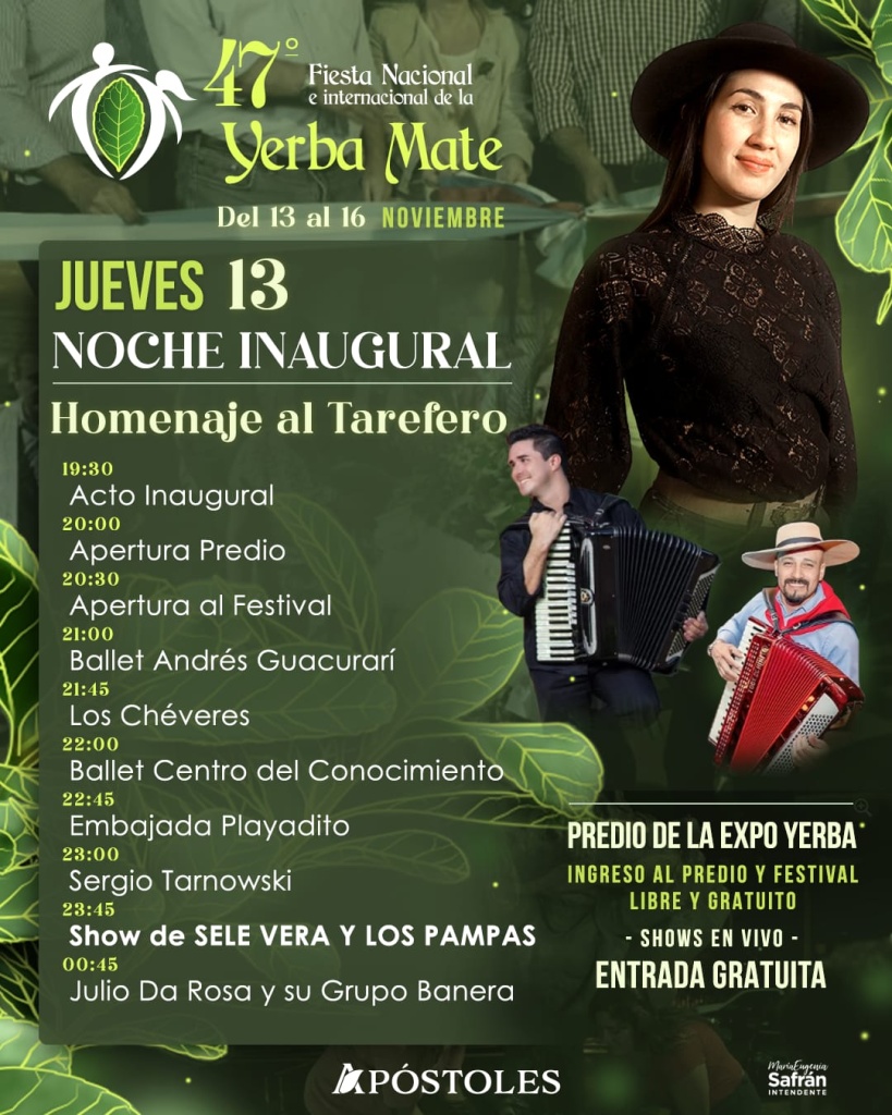 La ciudad de Apóstoles se prepara para recibir la 47° Fiesta Nacional e Internacional de la Yerba Mate, que se llevará a cabo del 13 al 16 de noviembre en el Predio de la Expo Yerba. Esta celebración se ha consolidado como uno de los eventos más importantes de la región, reuniendo a familias y visitantes en torno a la cultura y las tradiciones misioneras.