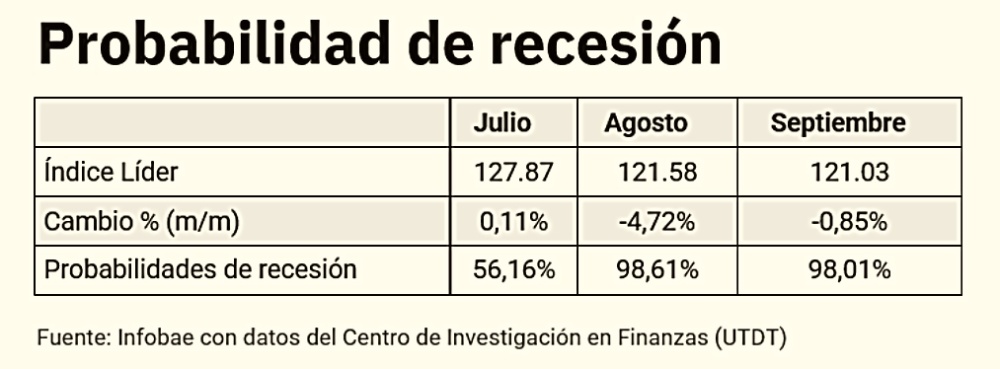 La tabla clave del informe permite observar la evolución de la probabilidad de recesión para los meses previos. En mayo, la probabilidad se situó en 57,08%; en junio, en 56,16%. En julio se mantuvo en 56,16% y finalmente, en agosto, trepó a 98,61%. Es el registro más alto informado desde, al menos, 2018.