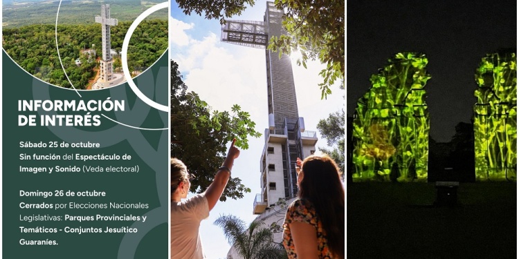 El Ministerio de Turismo de Misiones informó que este domingo 26 de octubre los principales espacios turísticos de la provincia permanecerán cerrados al público debido a la realización de las elecciones legislativas nacionales. Entre los sitios que no abrirán sus puertas se encuentran el Parque Temático de la Cruz, el Parque Provincial Moconá, el Provincial Salto Encantado y los Conjuntos Jesuítico Guaraníes de San Ignacio Miní, Santa Ana, Loreto, Corpus Christi y Santa María.