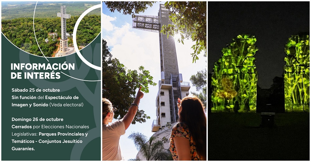 El Ministerio de Turismo de Misiones informó que este domingo 26 de octubre los principales espacios turísticos de la provincia permanecerán cerrados al público debido a la realización de las elecciones legislativas nacionales. Entre los sitios que no abrirán sus puertas se encuentran el Parque Temático de la Cruz, el Parque Provincial Moconá, el Provincial Salto Encantado y los Conjuntos Jesuítico Guaraníes de San Ignacio Miní, Santa Ana, Loreto, Corpus Christi y Santa María.