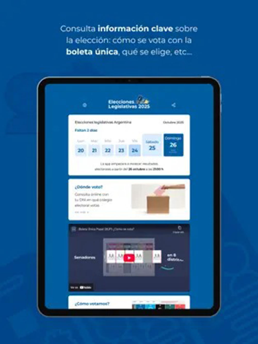 - Guía para Votar: La app también incluye información de utilidad sobre la jornada, destacando el paso a paso para votar con la modalidad de Boleta Única Papel.
