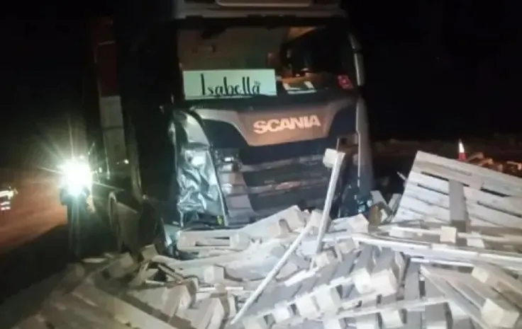 El siniestro se registró alrededor de las 22:15, cuando un camión Scania G310 con acoplado cargado de tarimas de madera perdió estabilidad tras el reventón de una cubierta delantera. A raíz del desperfecto, el vehículo se cruzó de carril, volcó sobre la banquina contraria y terminó colisionando contra otro transporte, un Scania Super 540, que circulaba en sentido opuesto.