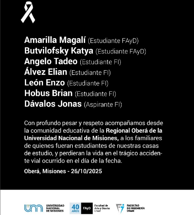 Por último, desde la UNaM, se declara tres días de duelo en señal de respeto y solidaridad con las familias y allegados de las y los estudiante fallecidos.