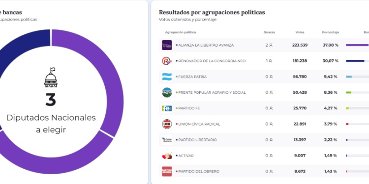 Con el 100% de las mesas escrutadas, los resultados oficiales del escrutinio provisorio en Misiones confirmaron este domingo por la noche la victoria de La Libertad Avanza (LLA), que alcanzó el 37,08% de los votos con 223.539 sufragios. En segundo lugar se ubicó el Frente Renovador de la Concordia NEO, con 181.238 votos, equivalentes al 30,07%, mientras que el tercer puesto correspondió a Fuerza Patria, con 56.780 votos, lo que representa el 9,42% del total.