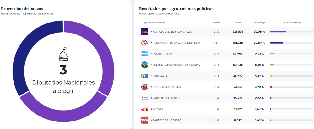 Con el 100% de las mesas escrutadas, los resultados oficiales del escrutinio provisorio en Misiones confirmaron este domingo por la noche la victoria de La Libertad Avanza (LLA), que alcanzó el 37,08% de los votos con 223.539 sufragios. En segundo lugar se ubicó el Frente Renovador de la Concordia NEO, con 181.238 votos, equivalentes al 30,07%, mientras que el tercer puesto correspondió a Fuerza Patria, con 56.780 votos, lo que representa el 9,42% del total.