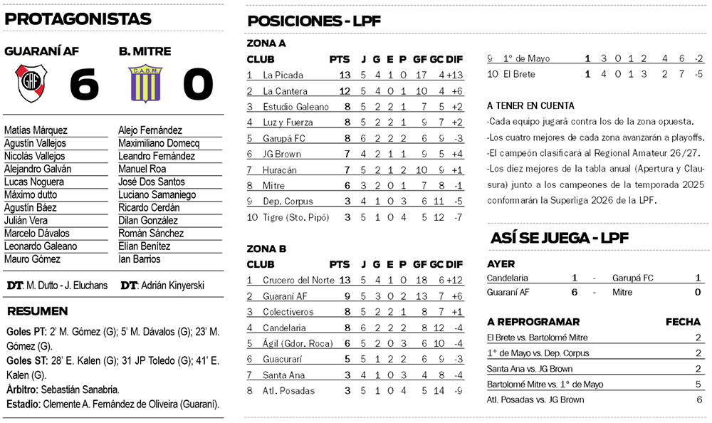 Guaraní Antonio Franco (GAF) tuvo una tarde para la historia: goleó 6-0 a Mitre en una nueva edición del clásico posadeño que se jugó ayer en el Clemente Argentino Fernández de Oliveira, se ubicó como escolta de la Zona B y dejó al “auriazul” sin invicto.