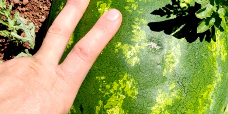 “Cosechamos martes y jueves. Las que vienen de Corrientes o Brasil llegan golpeadas o viejas, porque pasan días en los camiones. Una sandía recién cosechada se reconoce porque el tallo está verde”, explicó Lombardo.