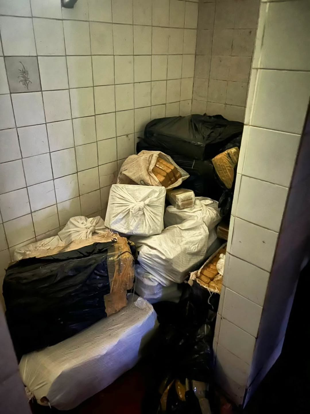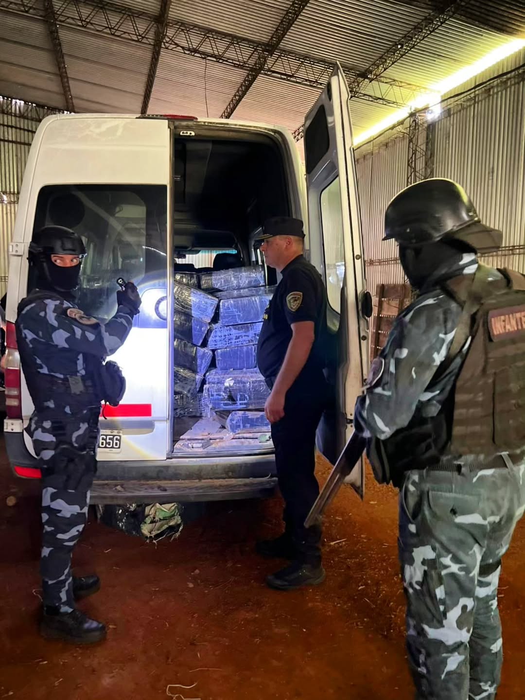 Al ingresar al galpón, los uniformados se encontraron con 94 bultos envueltos en plástico, que contenían ladrillos prensados de cannabis sativa, con un pesaje total de 3.100 kilos. Parte del cargamento se hallaba dentro de dos vehículos —una Mercedes Benz Sprinter y una Toyota Hilux— acondicionados para el transporte de la droga, mientras que el resto estaba estratégicamente distribuido entre las bolsas de mandioca.